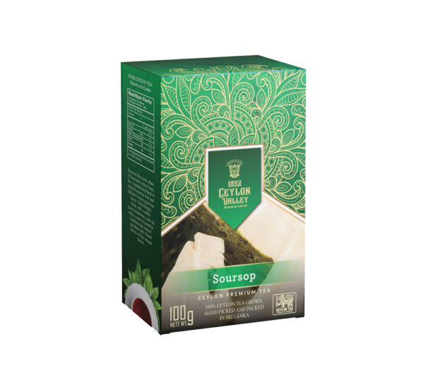 Indulge in the essence of paradise with 1852 Ceylon Valley’s Green Tea Soursop – 100g. Let every cup be a celebration of flavor and freshness, creating moments of pure bliss with every sip.
